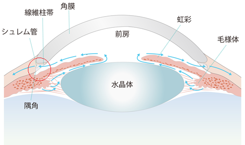 眼内での房水の動きを示している。房水は毛様体で産生され、水晶体や角膜に栄養を与えたのちに、線維柱帯を通ってシュレム管に入り、静脈から体に戻っていく。