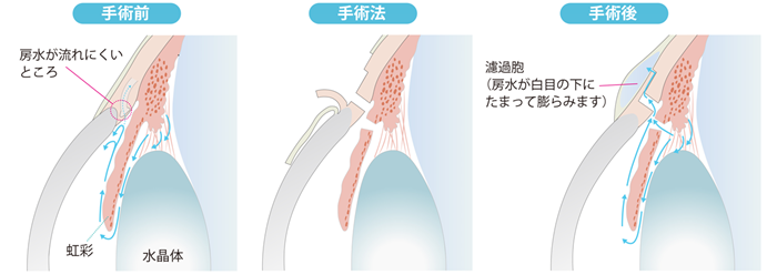 眼球に穴をあけて、房水を眼球の外に導く手術です。眼球の外といっても、涙になって出ていくわけではありません。房水は強膜(眼球の外壁である白目の部分)と結膜(白目を覆う表面の透明な膜)の間にとどまり(この膨らみを濾過胞といいます)、血管などに吸収されます。手術法は、まず、結膜と強膜とに切れ目を入れてはがします。そこから眼内の線維柱帯の一部と虹彩の一部を切除して、房水が眼外へ流れ出すようにします。最後に結膜と強膜を縫合します。緑内障手術で最も容認されている標準的な治療ですが、乱視、脈絡膜出血、低眼圧黄斑症、感染など、視力低下につながるさまざまな合併症を起こすこともあります。