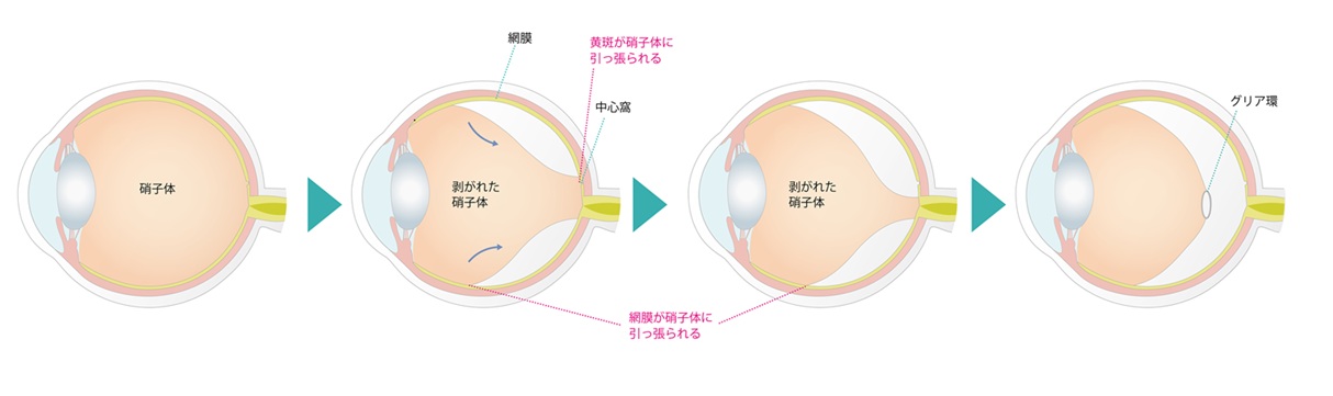 年齢を重ねると硝子体が収縮し、自然に網膜から剥がれていきます。