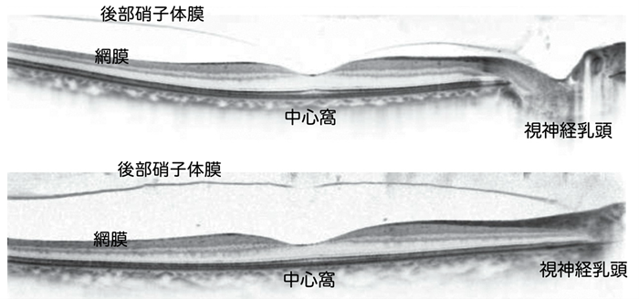 上のOCT画像では後部硝子体は視神経乳頭、中心窩ではまだ網膜に接着している。