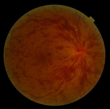 網膜中心静脈閉塞症の眼底写真。眼底全体に網膜出血が見られる。
