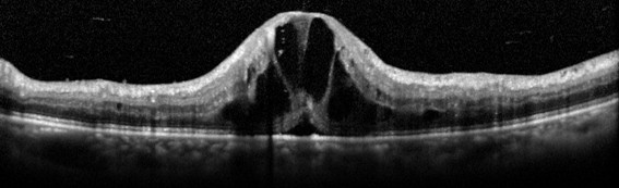 光干渉断層計(OCT)検査で、中心のむくみ(黄斑浮腫)の有無を確認します。