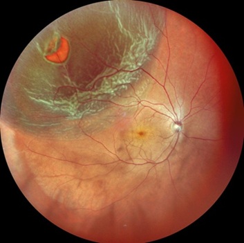 上方の弁状裂孔による裂孔原性網膜剥離を認める。